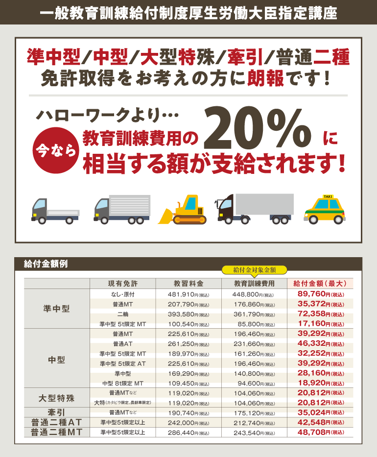 働く人の「雇用安定」と「再就職」の促進を図ることを目的とした、雇用保険の給付制度です。中条自動車学校では「準中型免許」「中型免許」「大型特殊免許」「牽引免許」「普通二種免許」を取得の際、この制度をご利用頂けるよう厚生労働大臣の指定を受けております。